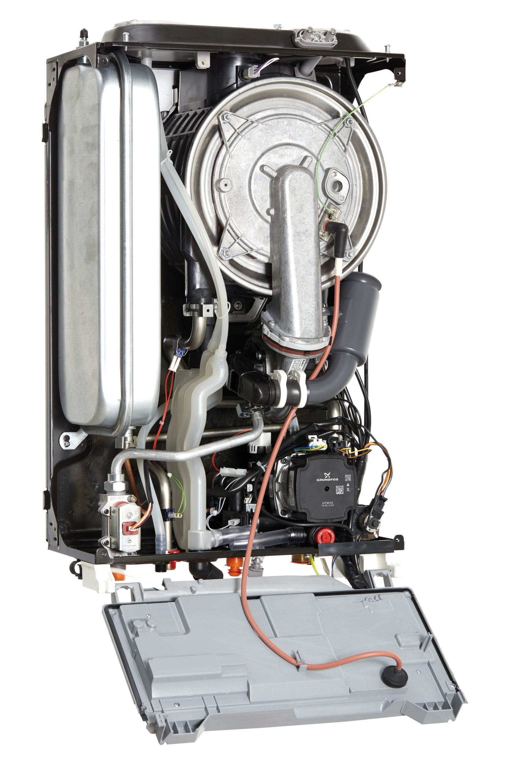 Kocioł gazowy kondensacyjny wiszący jednofunkcyjny (z możliwością podłączenia zewnętrznego zasobnika) z nowym wymiennikiem ze stali nierdzewnej w kompozytowej obudowie (w postaci jednorurowej wężownicy), przystosowany do zasilania gazem z dodatkiem 20% wodoru z szerokim zakresem modulacji mocy: moc c.o.: 2,7 ÷ 24,1 kW i kompaktowymi wymiarami.