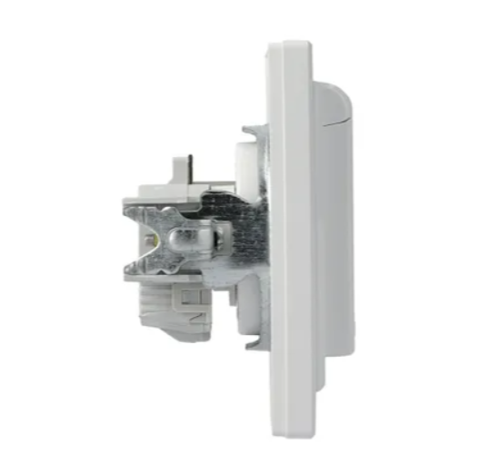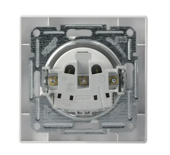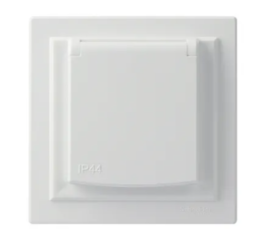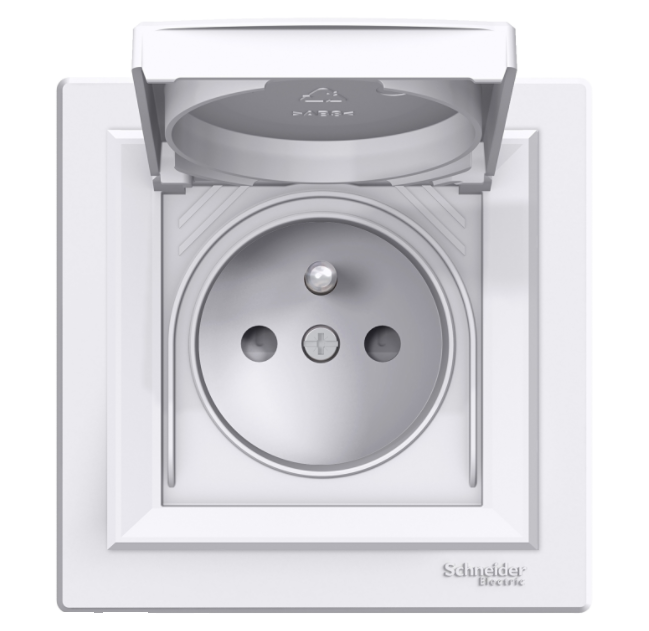 Schneider Electric, seria Asfora, gniazdo pojedyncze podtynkowe z ramką, z uziemieniem, klapką, do systemu ramkowego, 2P+PE w kolorze białym